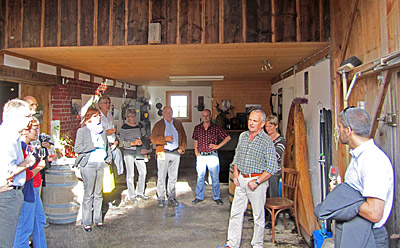Rund 30 Personen folgten der Einladung und trafen sich direkt bei der Familie Gschwind an der Birkenstrasse in Therwil. Nach der Begrüssung und der spannenden Einleitung von Stephan Gschwind durften wir auch schon zum ersten Mal den köstlichen Wein degustieren. Danach zeigte uns David Gschwind, welcher den Betrieb in naher Zukunft übernehmen wird, den Weinkeller. Im Keller konnten wir die vielen verschiedenen Weinfässer bestaunen und auch die neue Etikettiermaschine kam zum Einsatz. Danach durften wir noch einiges über den Betrieb erfahren, wie gross der Betrieb ist, welche Weinsorten angebaut werden und natürlich die unterschiedlichen Ansichten über den idealen Verschluss einer Weinflasche.